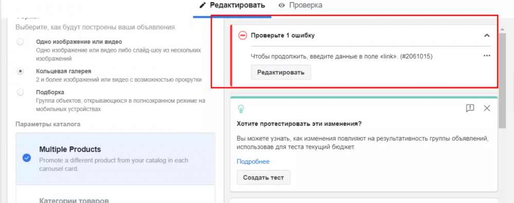 группы объявлений/объявления настроены с ошибками: не указана целевая страница, много текста на рекламном баннере, не настроено событие пикселя и другое. В таком случае следуйте указаниям в правом верхнем углу редактора кампаний: