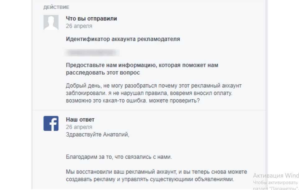 Если блокировку ошибочно наложил бот, то обычно достаточно отправить одно письмо с жалобой — аккаунт восстановится автоматически. При ручном бане переписка продлится дольше. Специалист обязан проверить соответствие объявления правилам Фейсбук, после чего вынести решение заново.