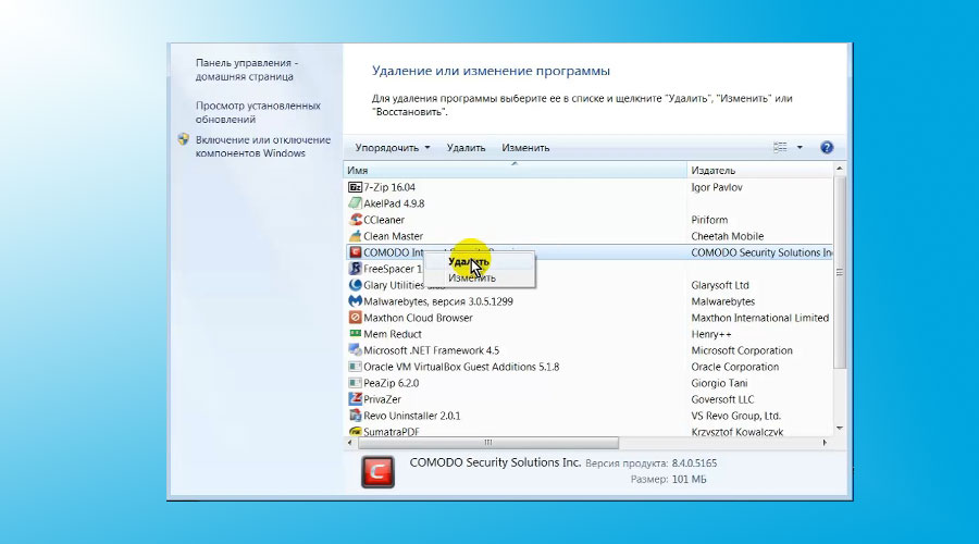 Откроется окно установленного софта. Находим здесь наш антивирус, то есть Comodo Internet Security. Нажимаем правой кнопкой — выбираем Удалить: