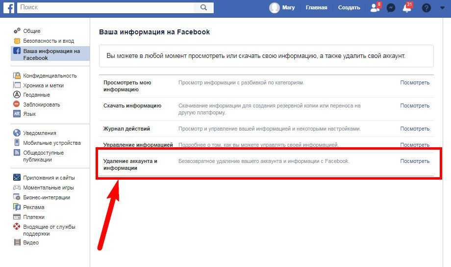 Удаление страницы профиля, соответствующее полное удаление всех ваших данных, переписки, фотографий и всех следов вашего пребывания в социальной сети Facebook.