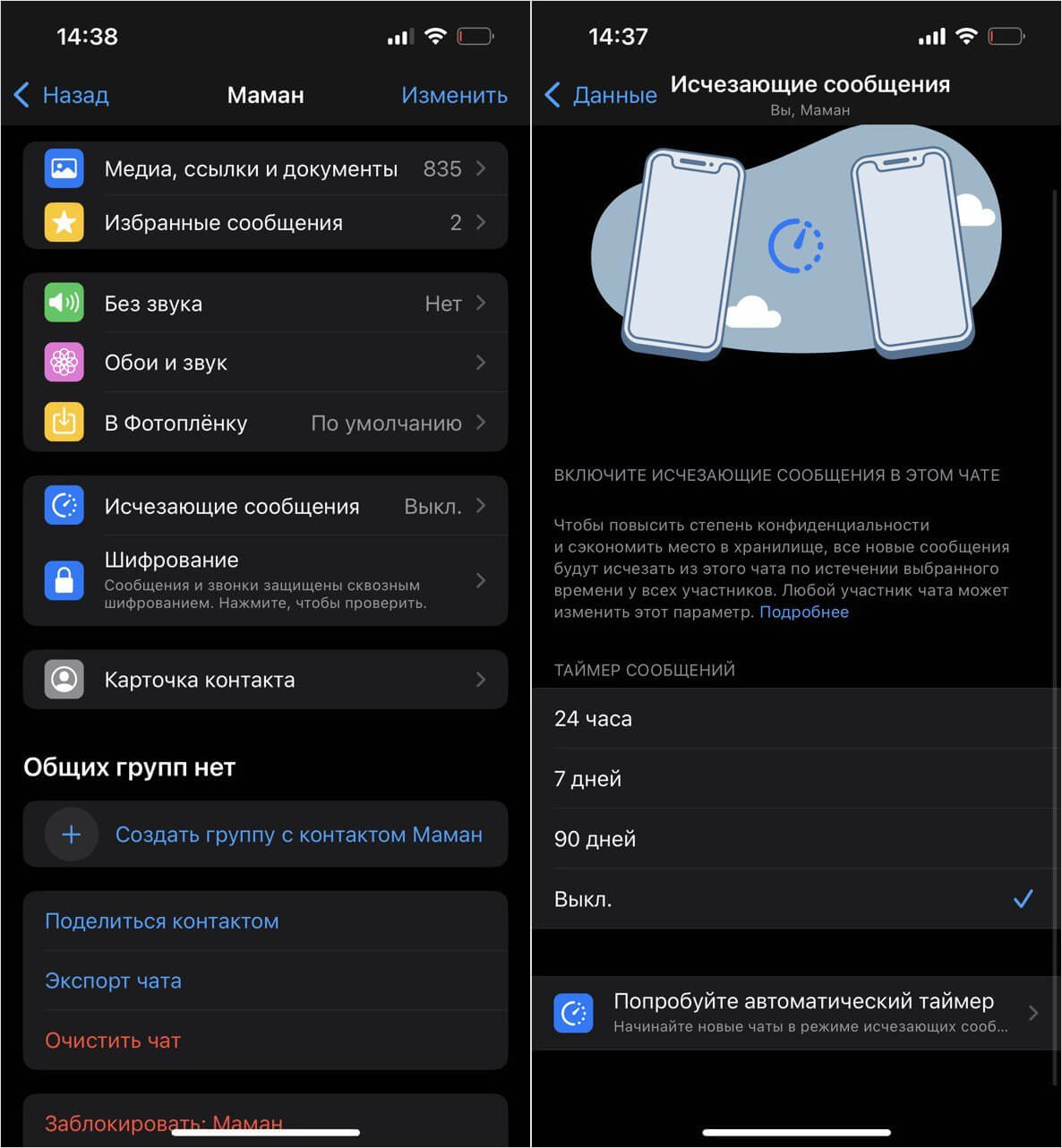 Выше описан самый простой способ быстро удалить сообщение. Но есть еще один, позволяющий почистить переписку в Ватсапе автоматически — это исчезающие сообщения. Дело в том, что они автоматически удаляются из переписки спустя 24 часа, 7 дней или 90 дней. Идеальный способ для тех, кто не особо доверяет своему собеседнику и не хочет, чтобы данные попали к третьим лицам. Включить автоудаление в Ватсапе очень просто.