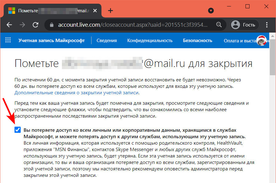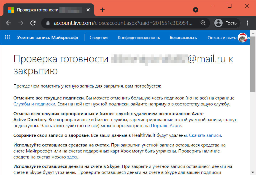Я рекомендую перед проведением этой процедуры заранее выйти из всех устройств (как это было показано выше) использующих учетную запись подлежащую закрытию. Сделать копии информации которая есть в OneDrive, так как она будет удалена. Далее, внимательно ознакамливаемся с последствиями закрытия аккаунта: