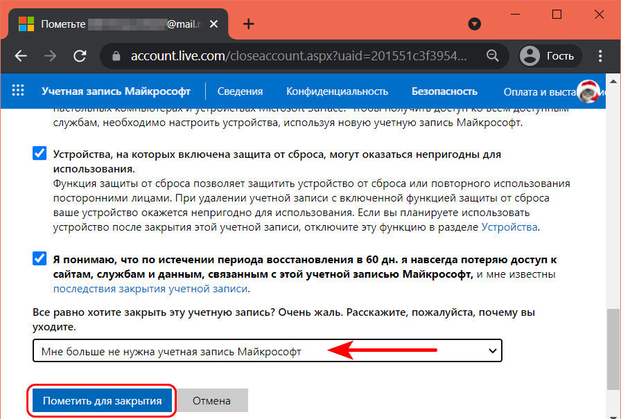 В разделе «безопасность» — «дополнительные параметры безопасности» в самом низу есть ссылка «закрыть учетную запись». Даны следующие рекомендации, чтобы человек полностью понимал, что он делает: