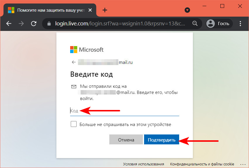 . Авторизуемся в аккаунте, вводим присланный на почту или телефон одноразовый код безопасности.