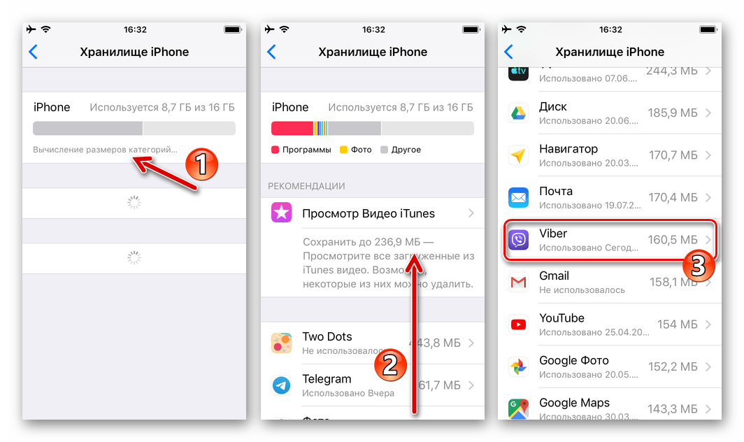 Дождавшись завершения анализа хранилища девайса, вы получите доступ к перечню инсталлированных программ. Найдите «Viber» в этом списке и коснитесь наименования клиента системы обмена информацией.