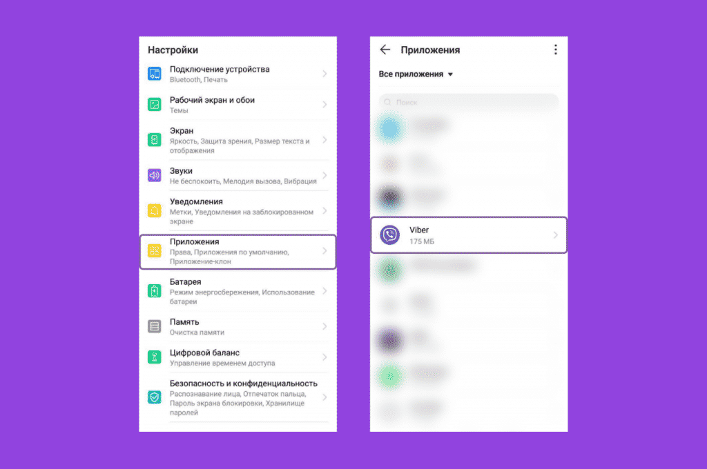 Откройте настройки своего телефона. Найдите в них вкладку «Приложения». На некоторых телефонах, после перехода в эту вкладку, приходится еще раз нажать кнопку «Приложения», которая находится в данной вкладке. Таком образом, Вы переходите к скачанным на смартфон приложениям, которые не были установлены по умолчанию. Вайбер является одним из таких.