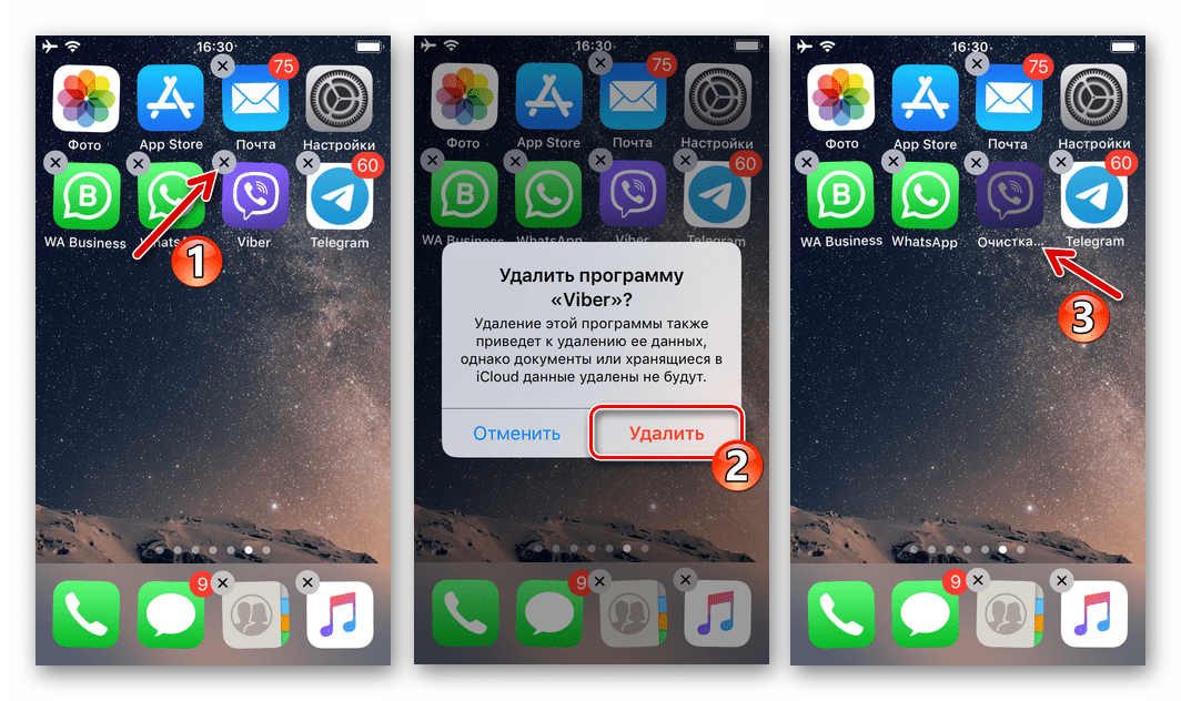 Нажмите на крестик, а затем подтвердите запрос-предупреждение операционной системы, коснувшись «Удалить». Через несколько секунд программа-клиент Вайбер исчезнет из перечня инсталлированного на айФоне софта.