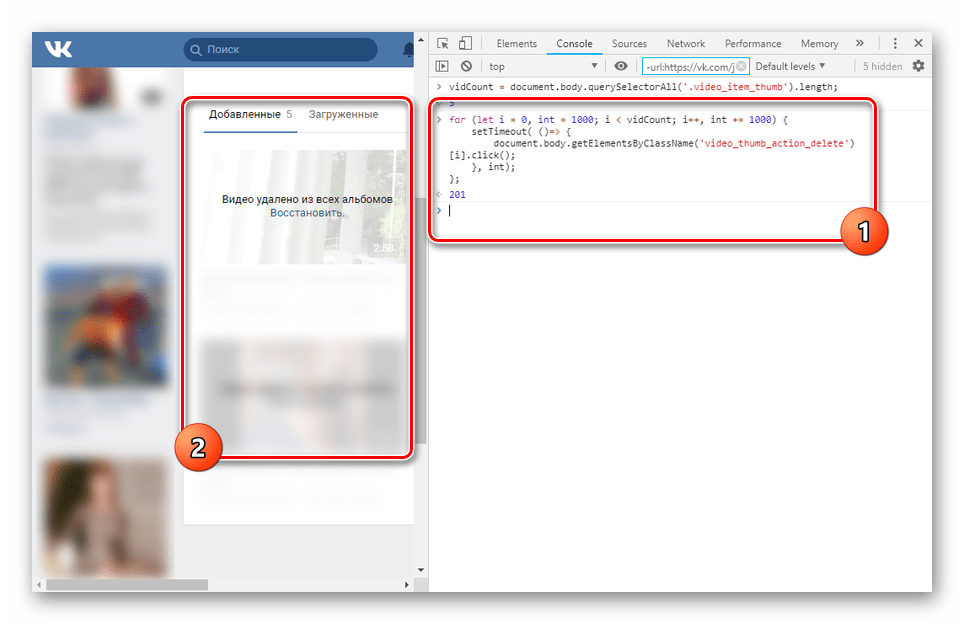 for (let i = 0, int = 1000; i setTimeout( ()=> < document.body.getElementsByClassName(‘video_thumb_action_delete’).click(); >, int); >;