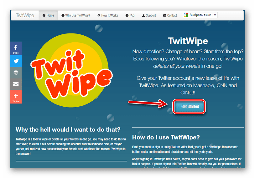 Способ №1. Перейдите на сайт TwitWipe и нажмите синюю кнопку Get Started (предварительно пройдите процедуру авторизации в своем аккаунте Твиттера).