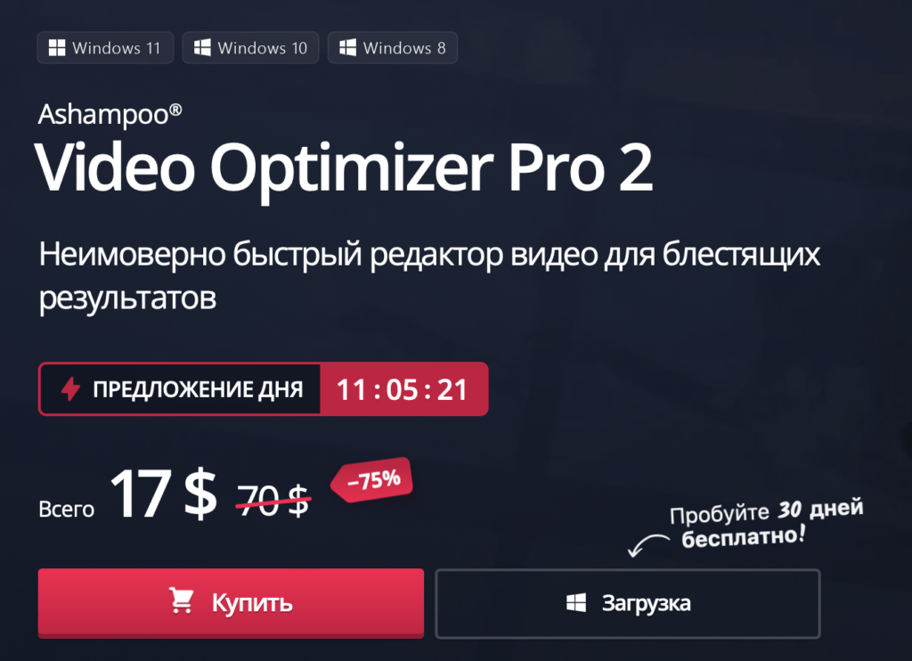Ashampoo Video Optimizer действительно заслуживает статуса профессионального редактора видеоматериалов с привлекательным и удобным интерфейсом. Этот инструмент позволяет вдохнуть новую жизнь в видео среднего качества и создать настоящее произведение искусства.