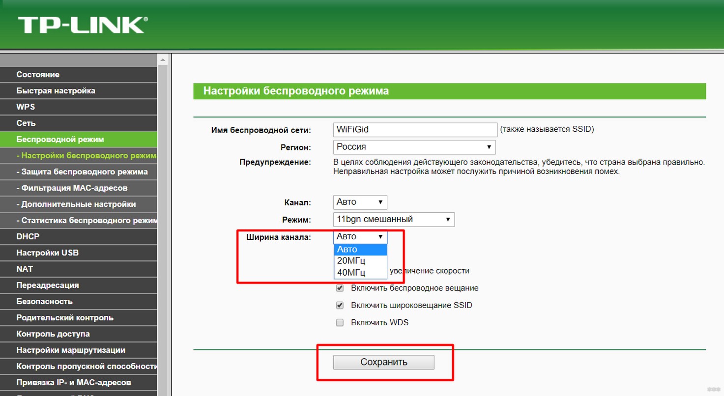 Рядом есть параметр «Ширина канала», он отвечает за пропускную способность. Предлагается выбор из двух вариантов — 20МГц и 40МГц, лучше конечно же 40, но старые устройства не могут работать при этом значении.