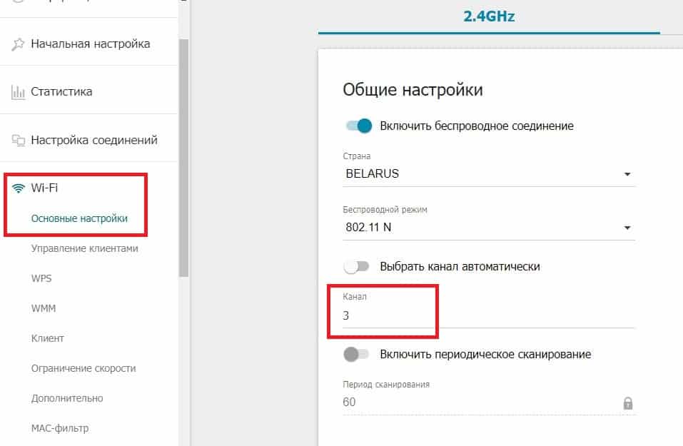 - Выберите в настройках своего беспроводного роутера тот канал, на котором имеется меньше всего помех.