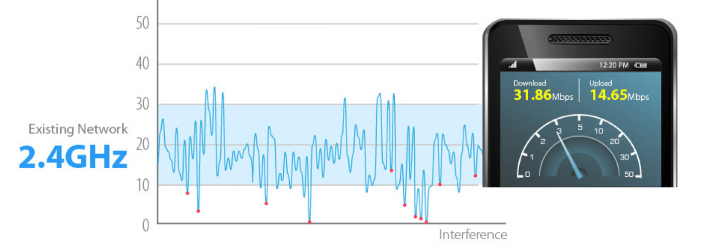 Стандартный диапазон частот 2,4ГГц используется почти везде. Бытовые приборы, камеры, роутеры соседей, прочая техника забивают каналы и создают помехи для вашего сигнала.
