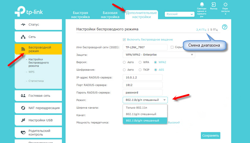 Выберите режим «802.11n»/»N only», n — это самое популярное поколение WiFi связи сейчас. Он не совместим со слишком старыми устройствами, однако лучше, чем «802.11b/g/n смешанный»/»Авто», который работает в том числе на прошлых поколениях для большей совместимости — b и g, что понижает качество сигнала. Встречаются и специальные режимы для устаревших устройств, например «Legacy» у ASUS.
