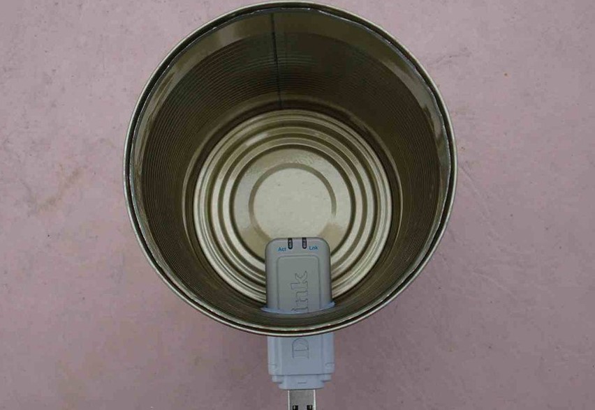 Для этих целей подойдёт любая жестяная или алюминиевая банка: пивная или консервная. Главное, чтобы её глубина варьировалась в пределах 7-10 см. Верхняя часть срезается, в нижней проделывается щель для модема. Оборудование сажается на клей, соединение выполняется через кабель.