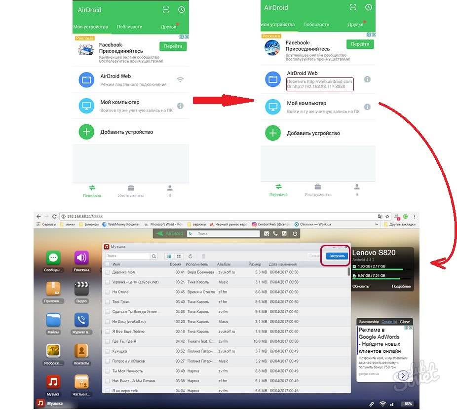 Загрузка треков с ПК на смартфон возможна и с помощью беспроводного Wi-Fi подключения. Для этого необходимо предварительно установить на мобильный гаджет одно из приложений PlayМаркет (“On Air”, “WebSharing” или “AirDroid”).