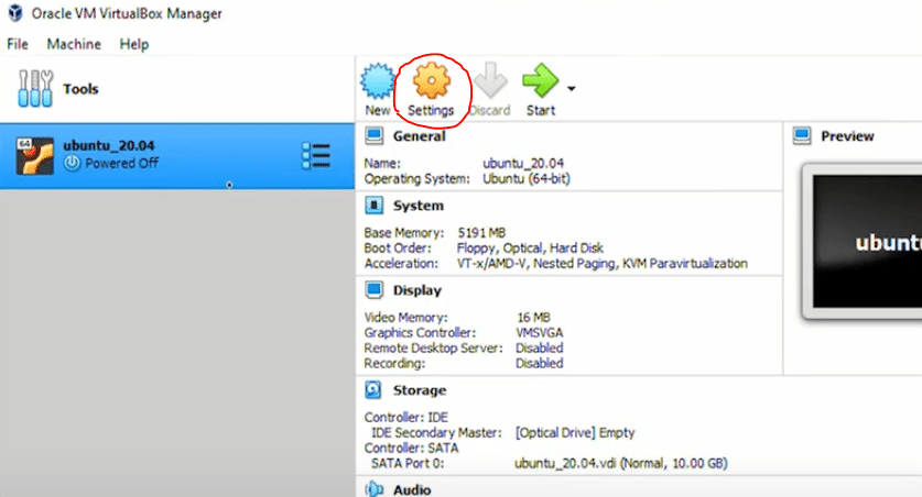 The virtual machine is almost ready to be started. All you need to do is attach the ISO as a virtual disk to the virtual CD/DVD drive. With Ubuntu 20.04 VM selected, click Settings to start it.