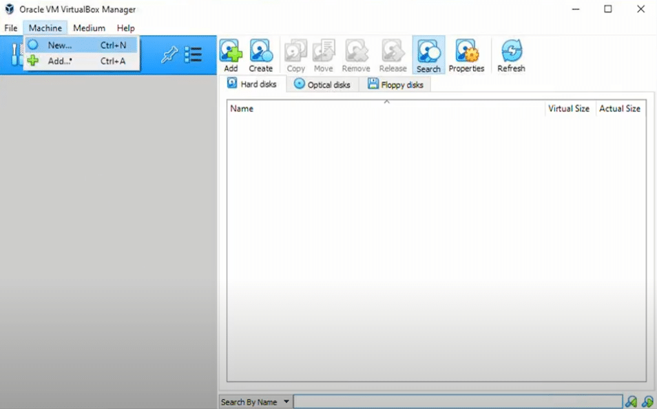 The first step in the VirtualBox Manager is to click on the ‘Machine’ menu and select ‘New.’