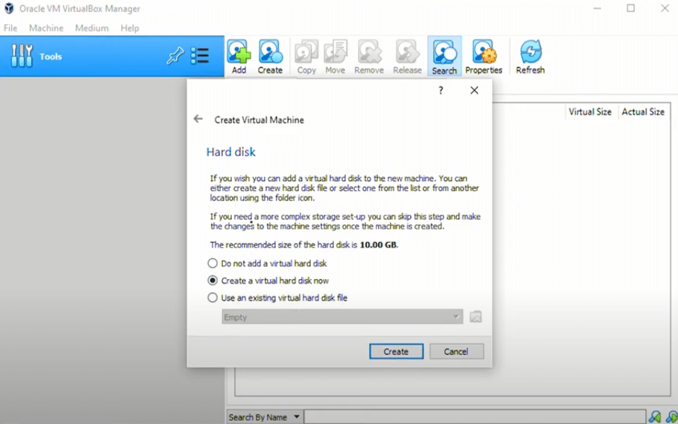 The next step is creating the virtual disk. Leave the default option of Create A Virtual Disk Now and click Create.