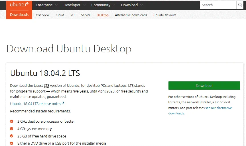 Click the green Download button and save the ISO file to the custom location. In our case, the file name is ubuntu-18.04.2-desktop-amd64.iso. Ubuntu 18 is provided only as 64-bit editions.