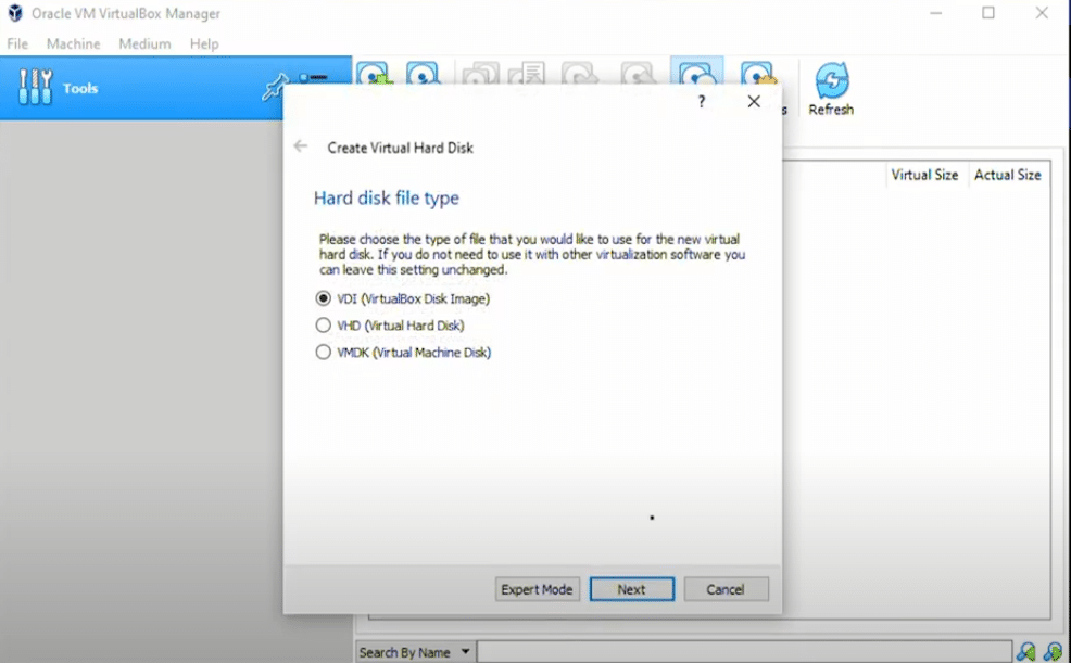 For the Hard disk file type, we are leaving VDI (VirtualBox Disk Image). Click ‘Next’