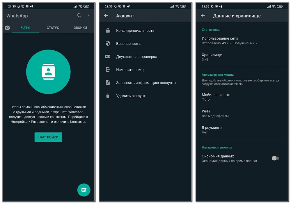 Для комфортного использования мессенджера желательно настроить все параметры под себя, отключив или включив определенные опции и режимы. Перейти к настройкам просто: нажимаем по трем точкам в углу экрана и в выпадающем меню выбираем «Настройки». Перед вами появится несколько вкладок, которые отвечают за изменение конкретных функций. Например, вы можете включить двухшаговую проверку доступа, чтобы обезопасить свой профиль и личные данные. С наиболее популярными настройками предлагаем ознакомиться в списке: