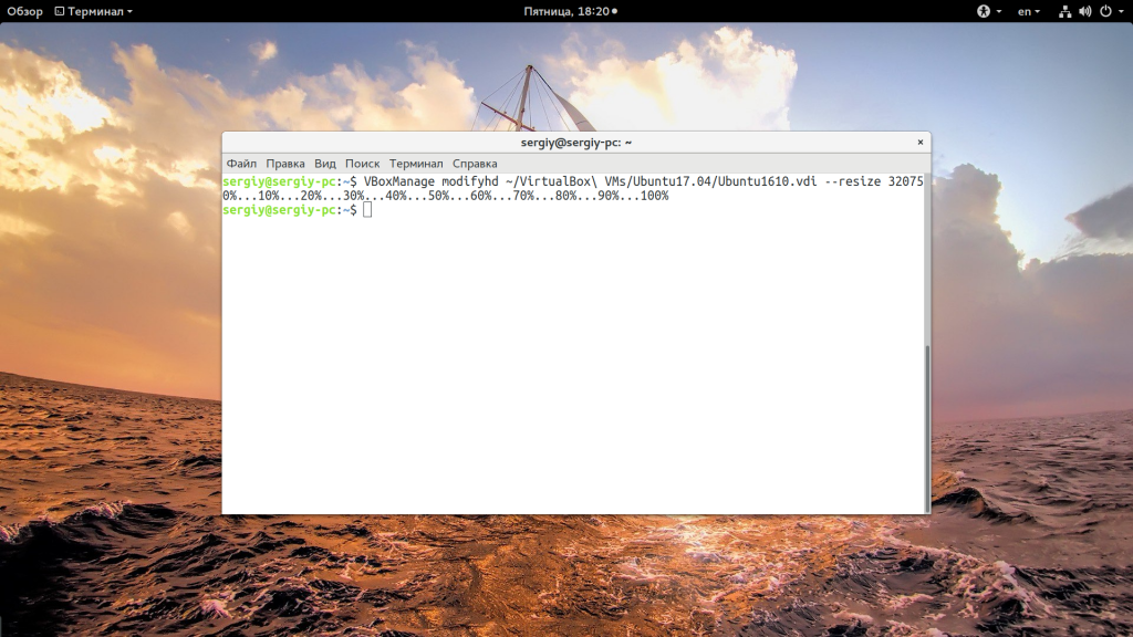 Затем, запустите команду чтобы увеличить размер диска virtualbox, как было описано раньше, путь к файлу замените на свой:
