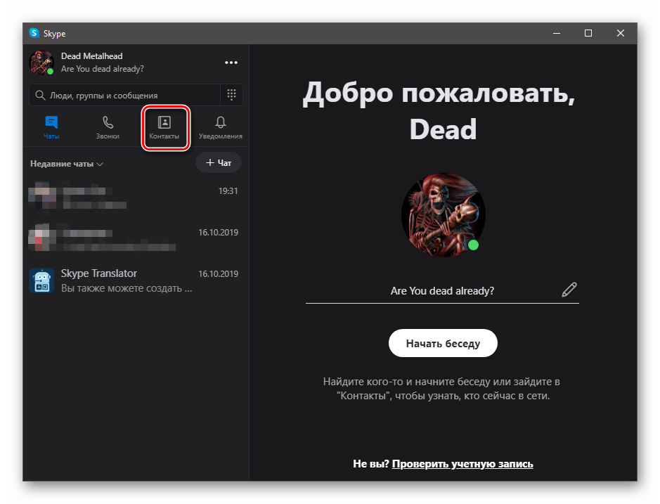 {“smallUrl”:”https://www.wikihow.com/images_en/thumb/9/96/Know-if-Someone-Blocked-You-on-Skype-Step-3.jpg/v4-460px-Know-if-Someone-Blocked-You-on-Skype-Step-3.jpg”,”bigUrl”:”https://www.wikihow.com/images/thumb/9/96/Know-if-Someone-Blocked-You-on-Skype-Step-3.jpg/v4-728px-Know-if-Someone-Blocked-You-on-Skype-Step-3.jpg”,”smallWidth”:460,”smallHeight”:342,”bigWidth”:728,”bigHeight”:542,”licensing”:”</div>”}</span>3Найдите пользователя в списке контактов в левой части окна.