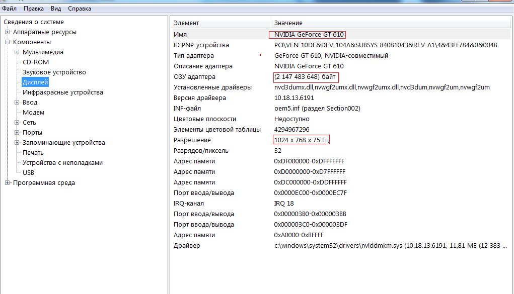 Теперь выбирается пункт «Компоненты» и в нём открывается подпункт «Дисплей». Здесь вы можете увидеть название и объём памяти карты, и установленное разрешение монитора. В последней строчке – название драйвера, используемого для работы видеоплаты, и его местонахождение.