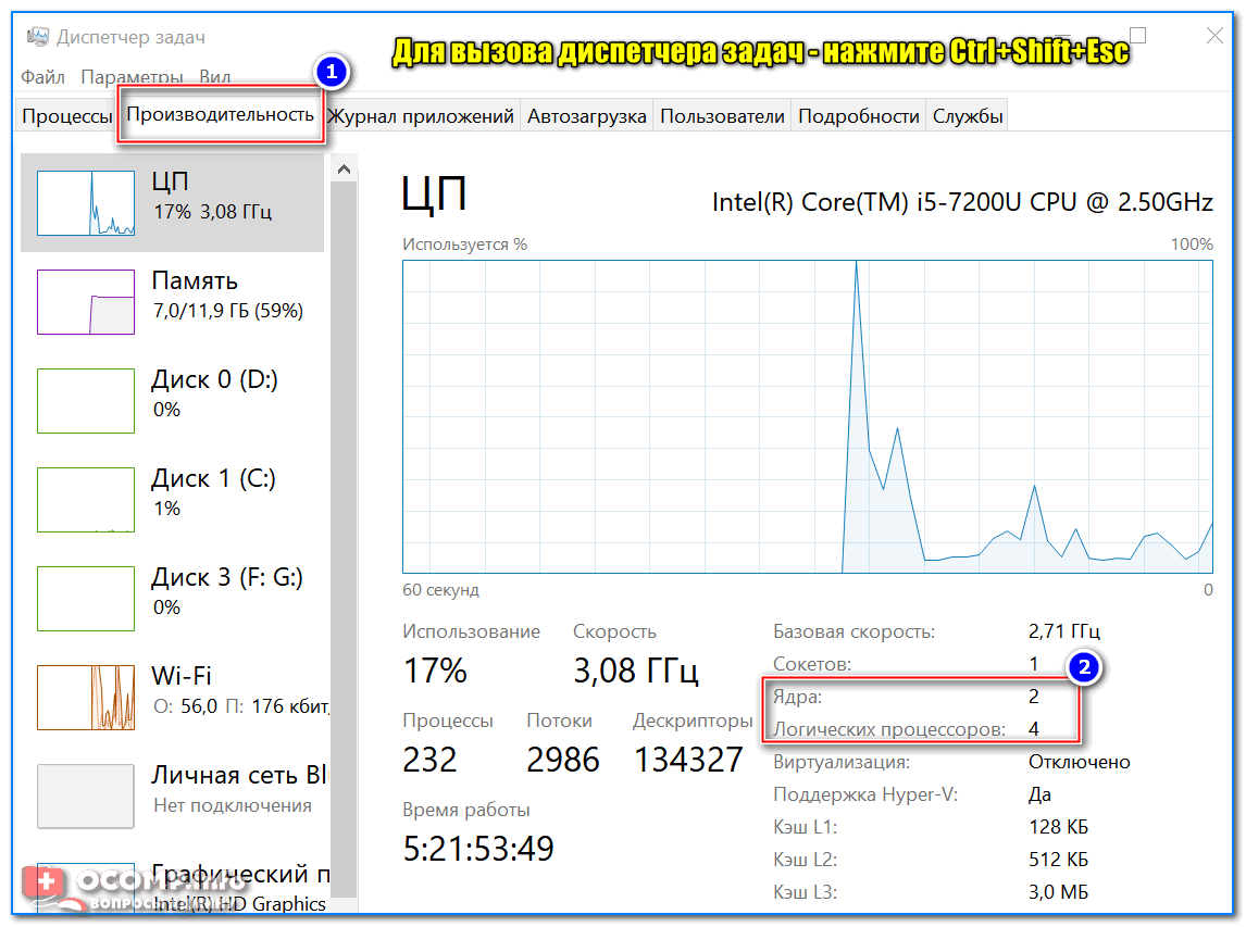 Далее нужно перейти во вкладку «производительность» и вы увидите количество ядер на компьютере. Кстати, этот способ самый простой, самый быстрый и один из самых достоверных.