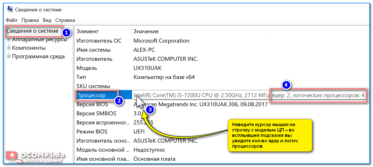 Если отображаемой в свойствах системы информации недостаточно, воспользуйтесь встроенной утилитой «Сведения о системе». Помимо марки и тактовой частоты она позволяет посмотреть, сколько ядер на компьютере Windows 7/10. Запускается утилита командой msinfo32 в окошке «Выполнить». Производитель, марка, частота и количество ядер будут указаны рядом с пунктом «Процессор».