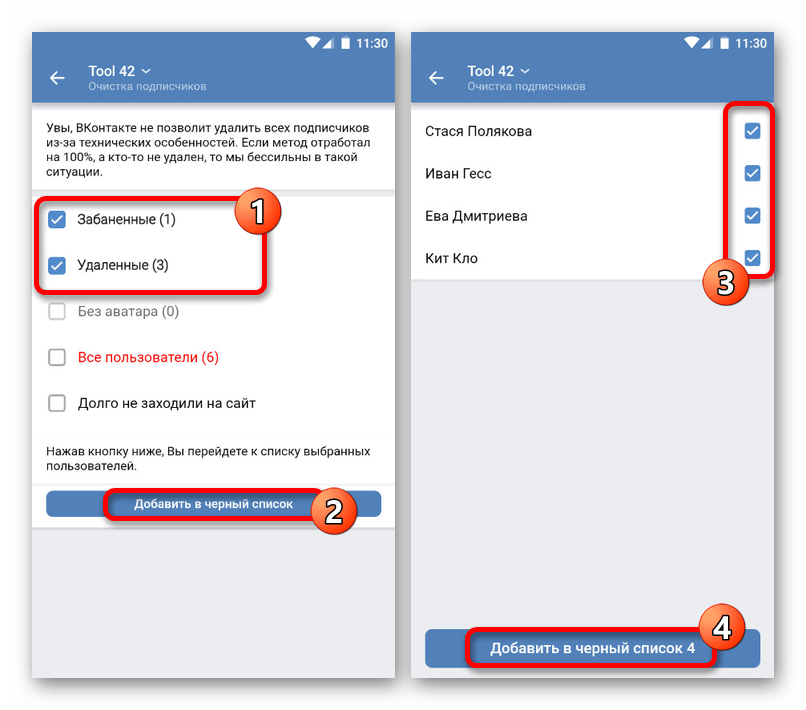 Если вы не хотите отдельно чистить подписчиков удаленных страниц, а удалить «собак» все же необходимо, воспользуйтесь кнопкой «Добавить в черный список» на экране выбора списка. Такой подход позволит вам блокировать пользователей, а не переводить их в подписчики.