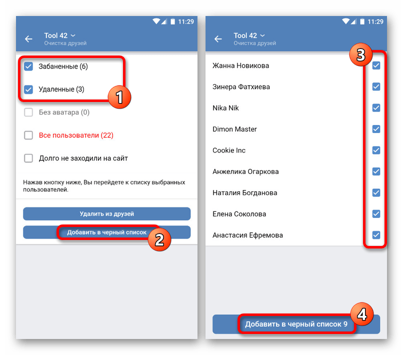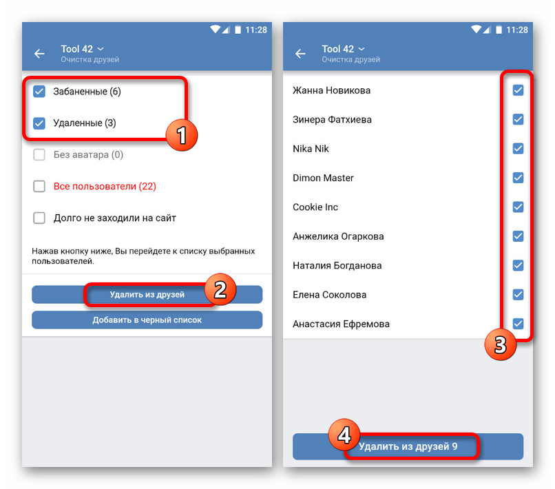 Установите флажок рядом со строками «Удалено» и «Запрещено», если хотите избавиться от «собак». Чтобы продолжить, используйте кнопку «Удалить из друзей» внизу экрана.