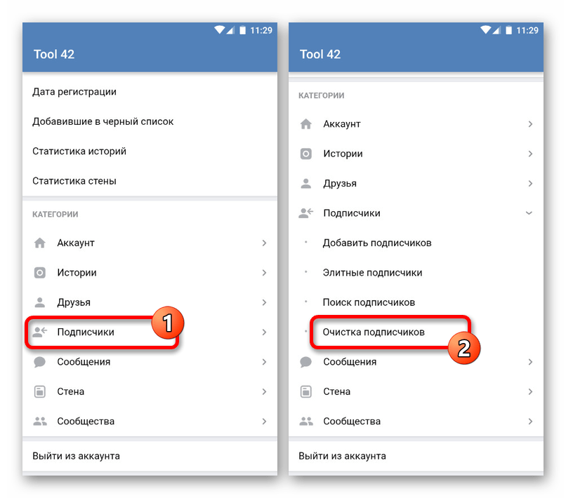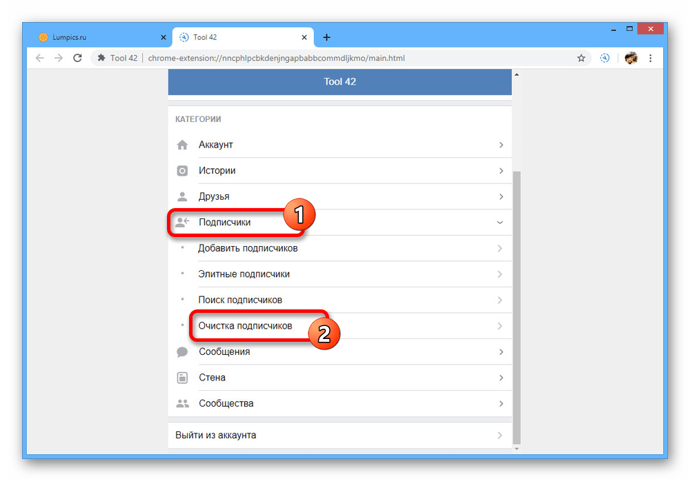 - Разобравшись с удаленными друзьями, вернитесь на главную страницу Инструмента 42, разверните список подписчиков и выберите параметр «Очистить». Этот шаг можно пропустить, но мы рекомендуем не оставлять «собачек» даже на подписчиках.