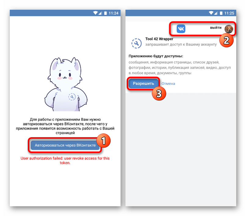 - Разверните установленное приложение и на главной странице нажмите кнопку «Авторизоваться через ВКонтакте». После этого вам нужно будет авторизоваться под своей учетной записью и предоставить доступ к странице.