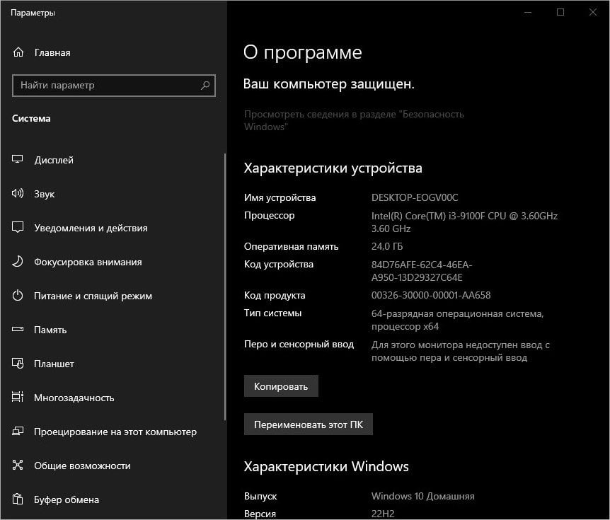 В пункте «Процессор» показана модель и частота ЦП. Ниже отображен объем оперативной памяти и разрядность ОС.