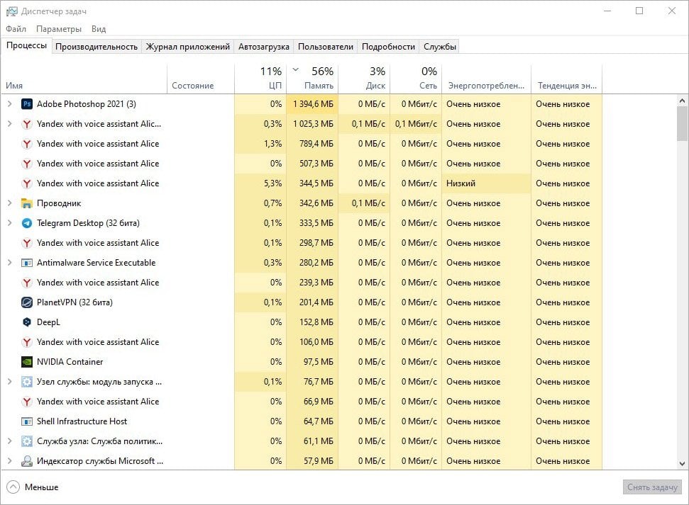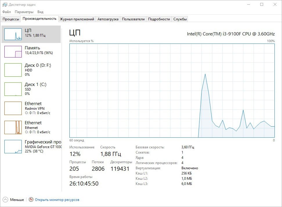 Еще один способ, как посмотреть характеристики компьютера — заглянуть в диспетчер задач. Да, в нем можно не только прервать ненужные процессы и закрыть зависшие программы, а узнать информацию о состоянии процессора, видеокарты, ОЗУ и жесткого диска.