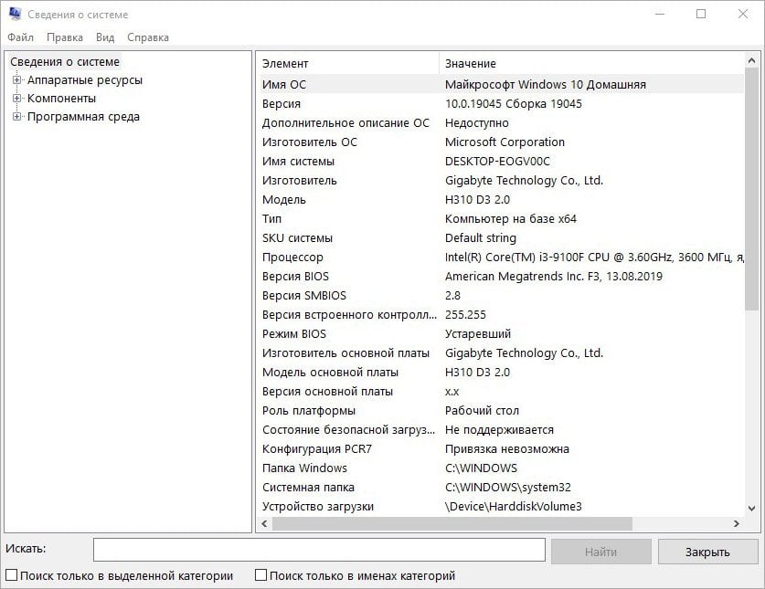 Сведения о системе — это инструмент Windows, который автоматически собирает данные о характеристиках ПК и выводит их на экран.