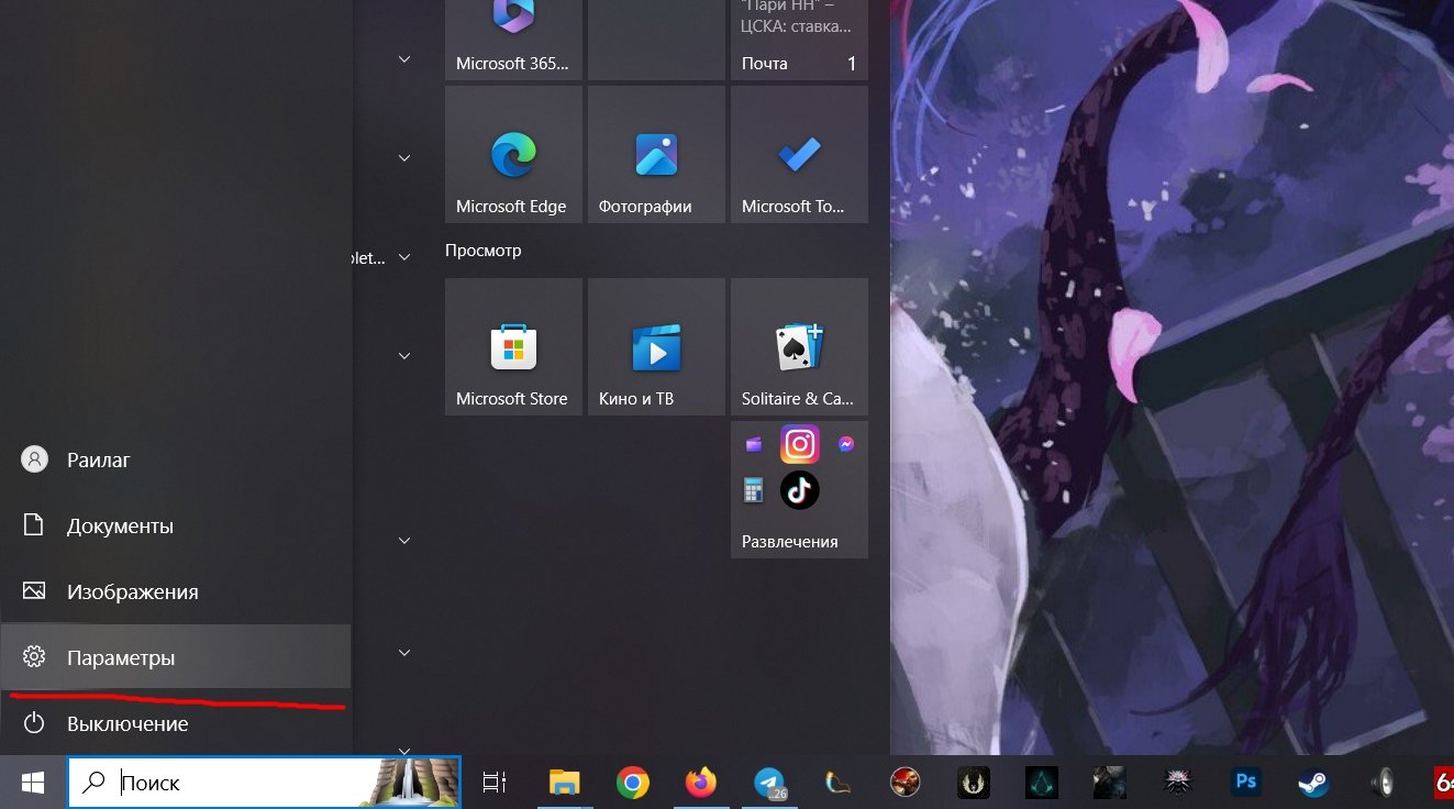 - Нажмите на «Пуск» и далее на кнопку «Параметры»;