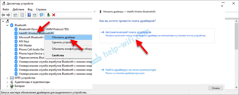 - В диспетчере устройств нажмите правой кнопкой мыши на Блютуз адаптер и выберите «Обновить драйвер».