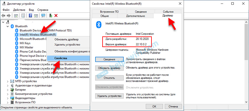 Перед обновлением (загрузкой новых драйверов) я рекомендую посмотреть версию и дату разработки установленного на данный момент драйвера. Чтобы вы могли ориентироваться при загрузке новой версии. Посмотреть эту информацию можно в свойствах Bluetooth адаптера, на вкладке «Драйвер».