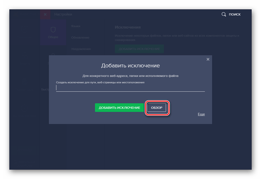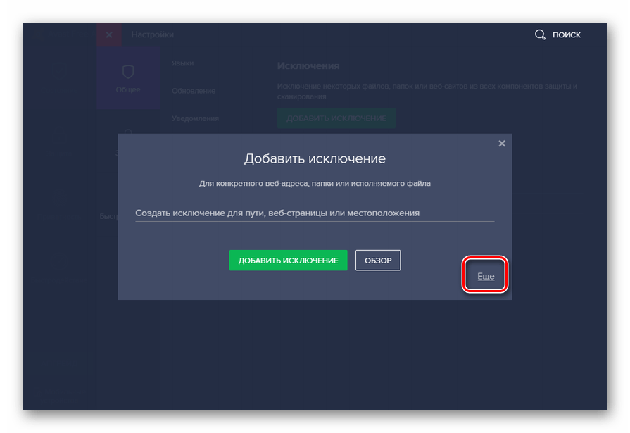 - Выполняйте все действия, которые были описаны в предыдущем способе до пункта 3 включительно. Затем в окне добавления исключения щелкните по элементу «Ещё».