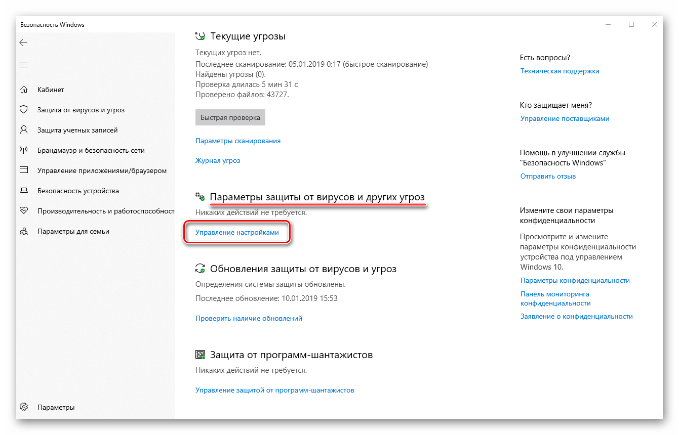 Далее воспользуйтесь ссылкой «Управление настройками», расположенной в блоке «Параметры защиты от вирусов и других угроз».