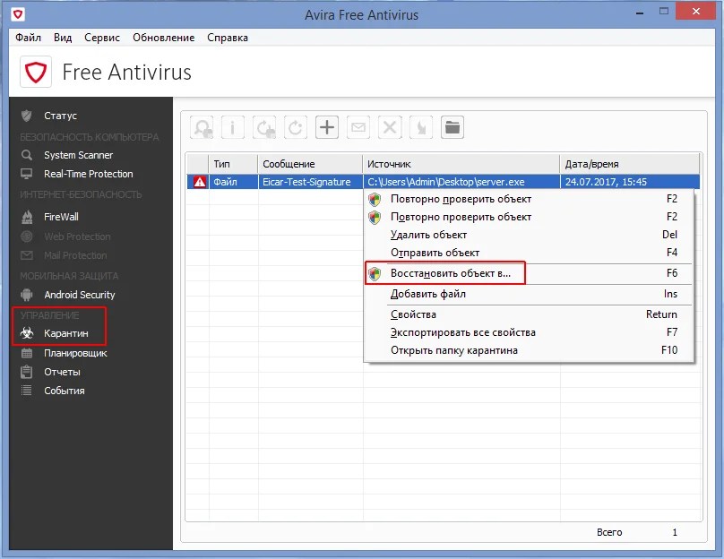 В главном окне слева, раскройте вкладку «Управление» и нажмите «Карантин». В правой части окна, будет список всех файлов, находящихся в карантине. Найдите в списке нужный вам файл, щелкните по нему правой клавишей мыши и выберите пункт «Восстановить объект в…».