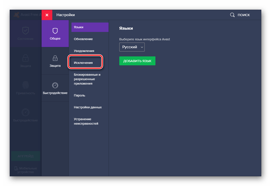 - Для исключения программы перейдите по пути «Настройки» — «Общие» — «Исключения».