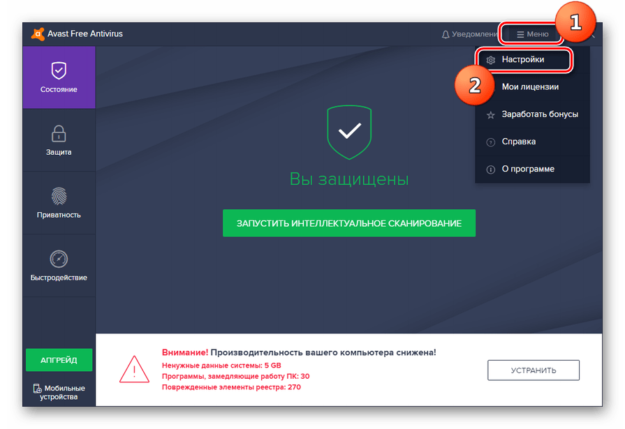 - Откройте интерфейс Avast и щелкните по элементу «Меню». Из раскрывшегося списка выберите пункт «Настройки».
