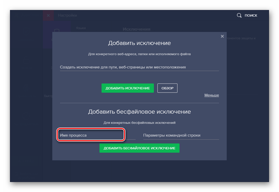 Существуют такие ситуации, когда невозможно определить, с каким конкретно файлом непосредственно связан определенный процесс. Для предотвращения ложных срабатываний в таких случаях в Аваст предусмотрена возможность добавления безфайловых исключений.