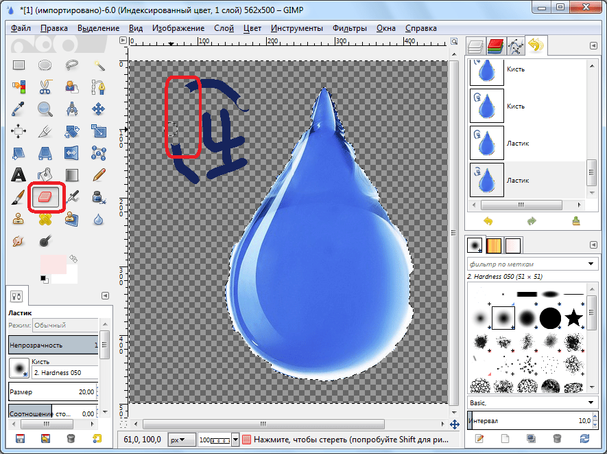 После удаления выделенного фона вы можете подкорректировать края ластиком, убирая лишнее. В также если остались ненужные области внутри изображения, можно опять выделить его указанными выше инструментами и нажать Delete.