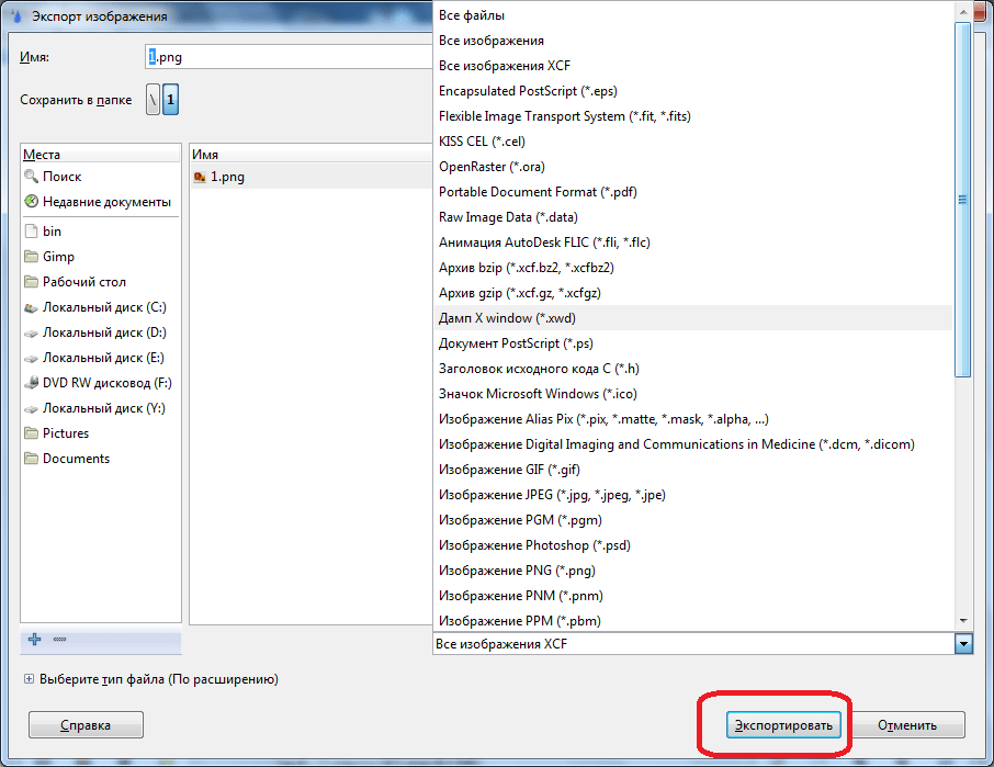 Перед нами открывается окно, в котором мы должны определить, где наш файл будет храниться, а также установить его формат. Доступен очень большой выбор сторонних форматов, начиная от традиционных форматов изображений PNG, GIF, JPEG, и заканчивая форматами файлов для конкретных программ, например Photoshop. Как только мы определились с местом расположения изображения и его форматом, кликаем на кнопку «Экспортировать».