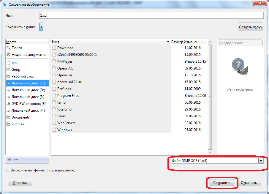 При этом появляется окно, где мы должны указать директорию сохранения заготовки, а также выбрать в каком именно формате хотим её сохранить. Доступен файловый формат сохранения XCF, а также архивные BZIP и GZIP. После того, как мы определились, жмем на кнопку «Сохранить».